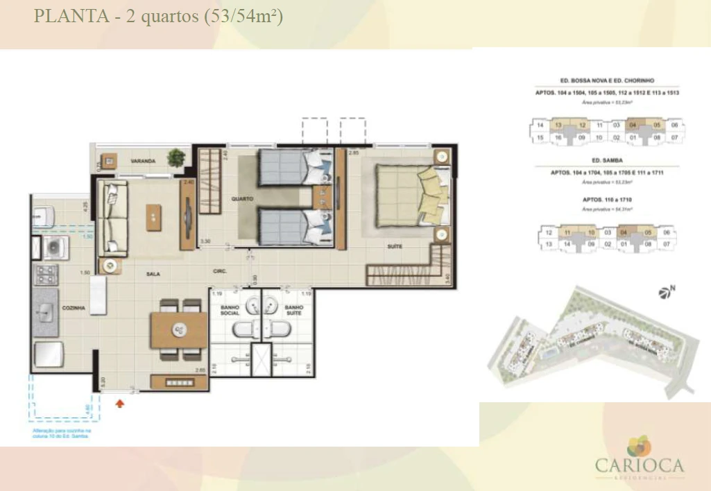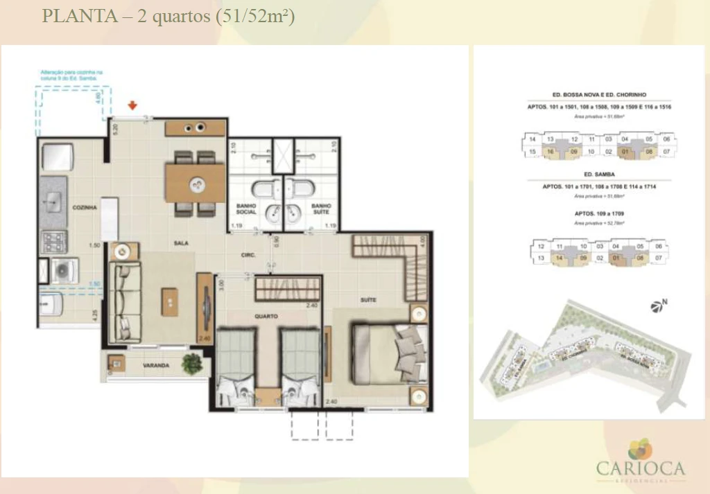 Apartamentos de 2 quartos com área privativa de 51 m2 até 54m²
